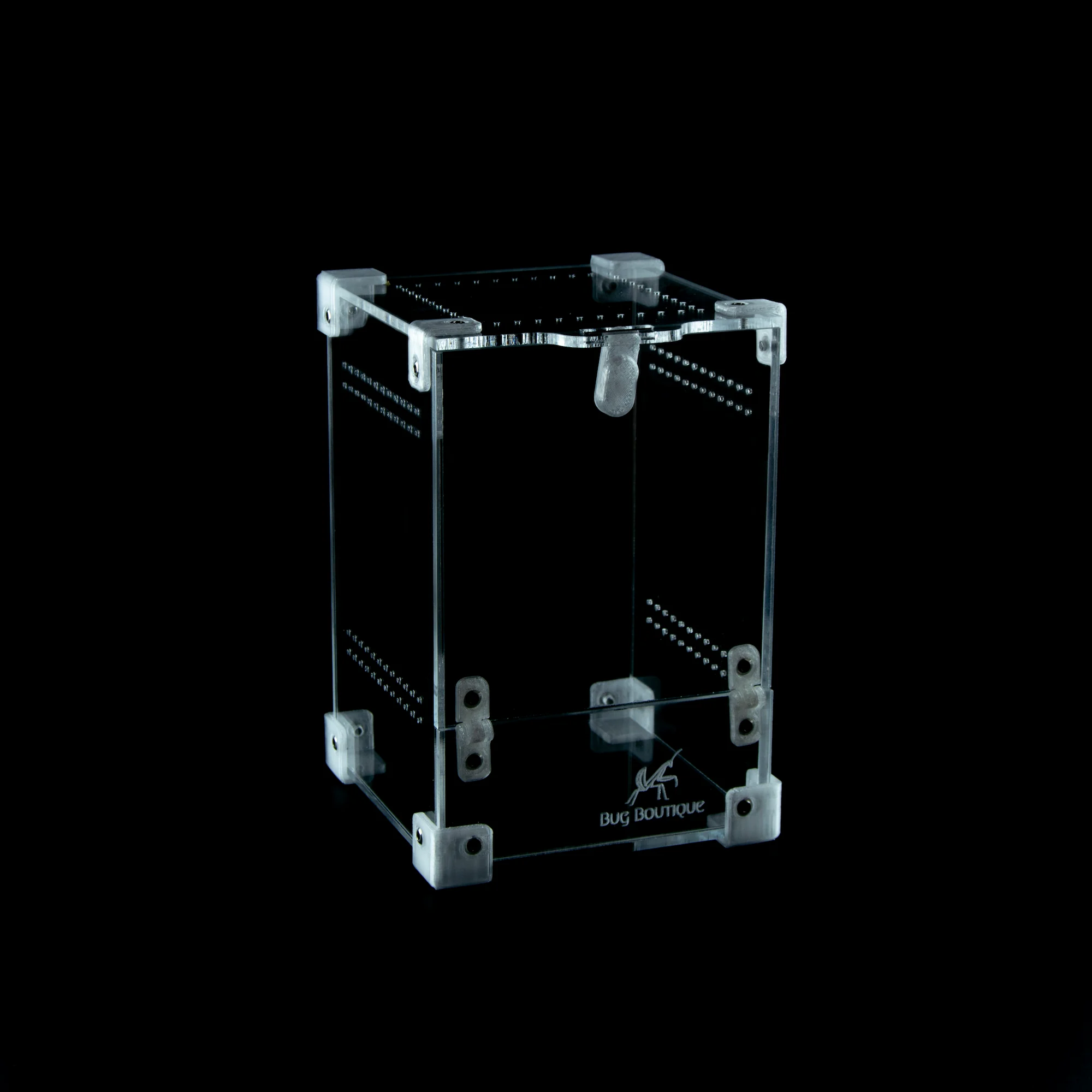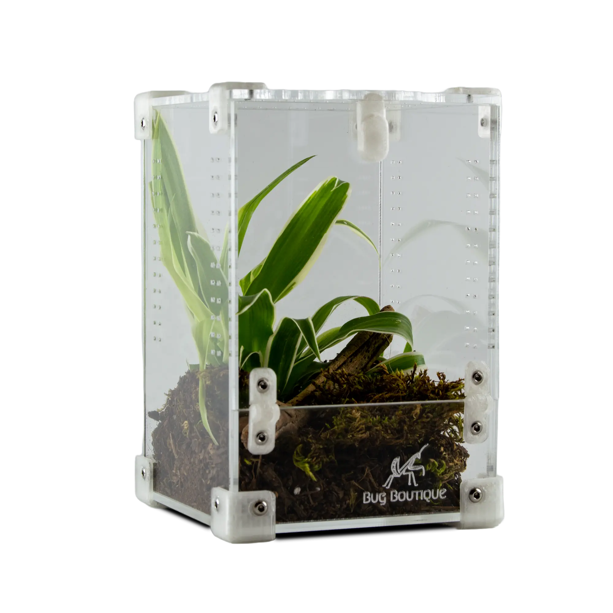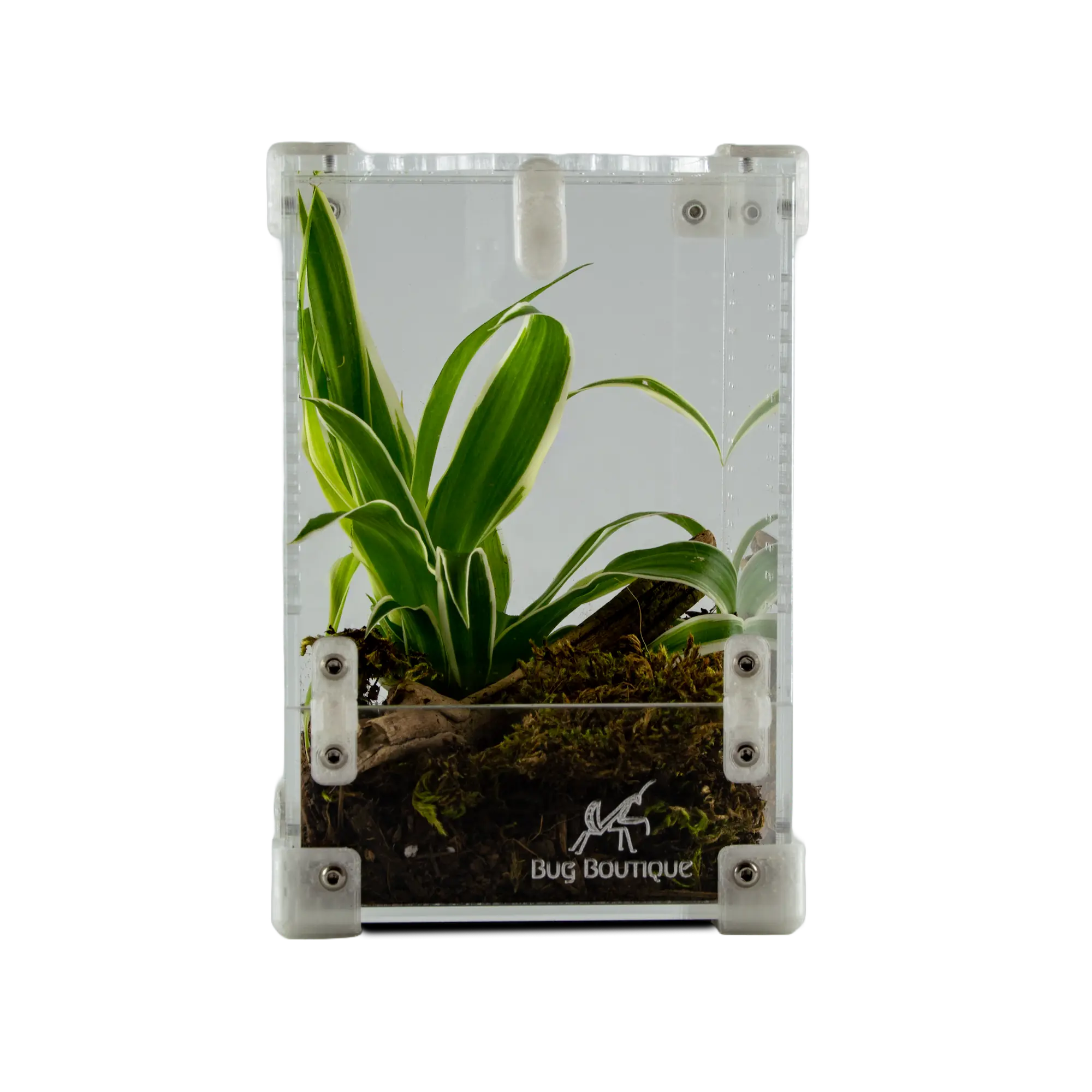 BugBox Mini måler 15 × 10 × 10 cm og er den alsidige udgave af vores populære Mini-model. Den er skabt til små terrestriske arter som edderkopper, biller, tusindben, skolopendre, små skorpioner og andre mindre insekter, der trives tæt på jorden.